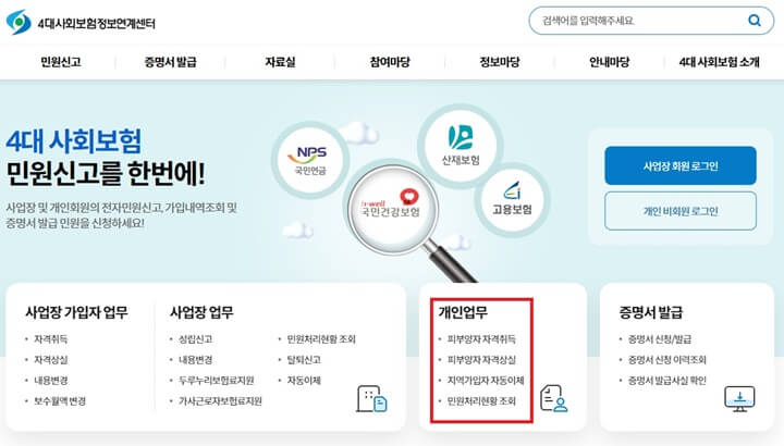 Step1. 4대 사회보험정보연계센터 홈페이지 접속 → 개인업무 → 피부양자 자격취득 클릭