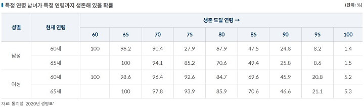 위 통계가 내가 얼마나 생존할 수 있는지 알려주지는 않습니다. 가장 중요한 것은 자신의 재무와 건강상태를 잘 고려해서 신중하게 결정하는 것입니다. 평소 노후를 위해 꾸준하게 재무관리에 대한 관심을 가지고 건강을 잘 유지하는 것이 노후 설계의 기본이라 할 수 있겠습니다.