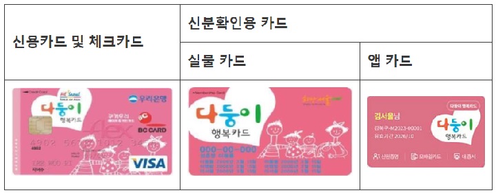 | ♣ 신분확인용 카드 ▷▷다둥이 신용, 체크카드의 기능은 미제공되고, 서울시 협력 업체 이용 시 할인 및 적립혜택을 제 ▷▷ 다둥이 앱카드와 신분용 확인카드 두개 모두 발급 불가 |