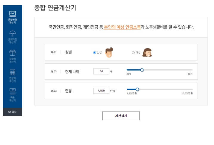현재 나이, 보유 금융자산, 매월 저축금액, 저축기간, 매년 평균 수익률(예상) 값을 입력하면 노후에 매월 얼마의 연금을 받을 수 있는지 예상할 수 있습니다. 연금상품 가입 후 투자 수익률을 예상해 추계할 때 아주 유용하게 사용할 수 있으니 활용해 보시기 바랍니다.