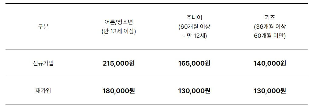 둘모아 연간이용권 이용요금은 성인기준 신규가입 시 215,000원, 재가입 시 180,000원, 주니어 경우 165,000원, 재가입 시 130,000원입니다.