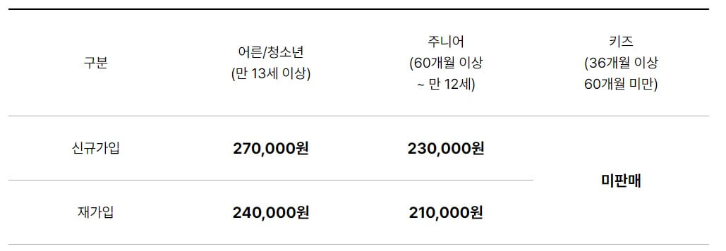 다모아 연간이용권 이용요금은 성인기준 270,000원, 재가입 시 240,000원, 주니어 신규가입은 230,000원, 재가입 시 210,000원입니다. 키즈(36개월 이상 60개월 미만)는 가입대상이 아닙니다.