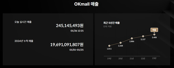 오케이몰은 코로나 펜데믹으로 경기불황이 수년째 이어지고 있는 상황에서도 적자로 힘들어하는 경쟁사들과 비교해 20년 가까이 연속 매출 성장 및 영업이익 흑자를 기록하며 연평균 50% 이상의 매출 성장세도 함께 유지하고 있습니다. 명품 이커머스 업계 선두주자임을 슬로건화 해서 내건 'WHY no.1' 메뉴를 통해 실시간 매출, 영업이익, 당일발송/묶음배송 등을 공개해 투명한 운영을 보여주고 있습니다. 이는 고객들의 신뢰를 쌓는데 주요한 요인을 보입니다. 이를 실시간 공개해 투명한 운영방식을 보여줍니다.