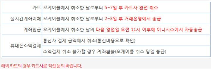 결제 방식에 따라 은행사나 카드사 등의 처리 기간이 소요되기 때문에 아래와 같이 결제 종류에 따라 처리 기간을 확인하여 주시기 바랍니다.