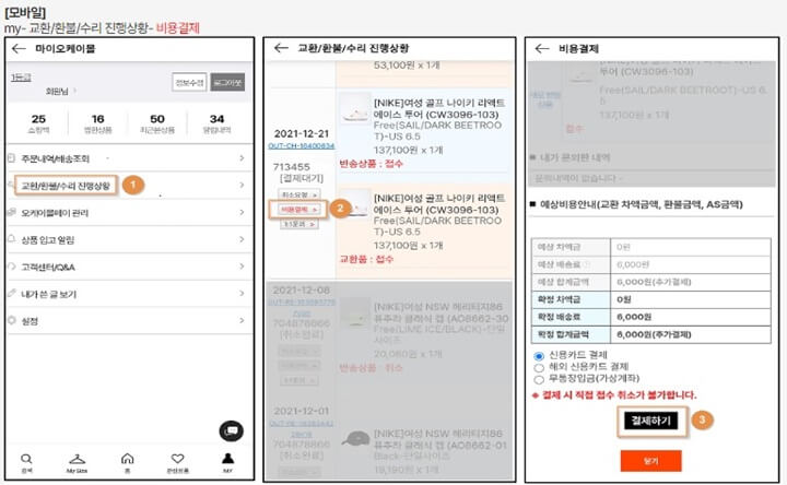 Ans. 오케이몰 홈페이지 'my - 교환/환불/AS현황'에서 배송료 및 차액금을 결제하실 수 있습니다. (단 , 해외 배송 건은 상품 교환이 불가능)