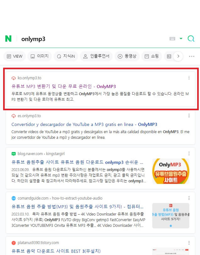 Onlymp3도 y2mate와 방식이 거의 동일합니다. 인터넷 포털(네이버 등)에서 'onlymp3' 검색 후 상단의 ko.onlymp3.to 사이트를 클릭 후 접속하세요. 또는 인터넷 주소창에 다음 주소를 복사해서 'ko.onlymp3.to' 붙여 넣기 후 접속하시면 됩니다.