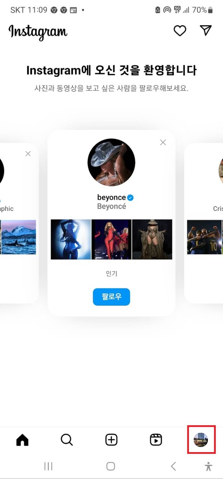 Step1. 인스타 어플 실행, 첫 화면에서 우측하단 '프로필사진' 클릭