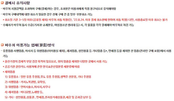 (사용제외 업종) 유흥업소(일반 유흥 주점업, 무도 유흥 주점업, 생맥주 전문점, 기타 주점업), 사행업종(카지노, 복권방, 오락실), 위생업종(안마시술소, 마사지, 사우나), 레저업종(비디오방, 노래방 등), 기타(성인용품, 상품권 등), 전자상거래상품권 등