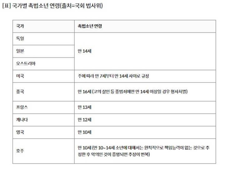 독일, 일본, 오스트리아는 대한민국과 동일한 만 14세이고 대한민국보다 낮은 연령대의 국가는 프랑스(만 13세), 캐나다(만 12세), 영국, 호주(만 10세)가 있습니다.