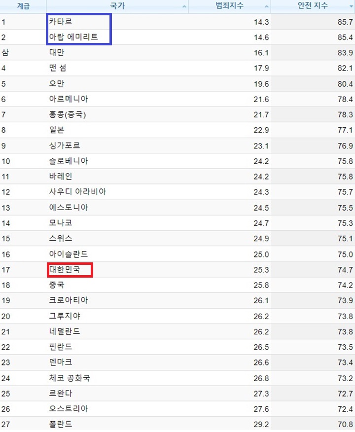 국제통계사이트 넘베오(NUMBEO) 데이터를 참고해 보면 엄격한 법령기준을 자국 내 적용하는 국가인 카다르와 아랍에미레이트연합이 2023년 상반기 범죄지수 및 안전지수 상위 1위, 2위를 차지했습니다. 범죄발생에는 다양한 복합적인 요소들이 존재하겠지만 대한민국(17위) 보다 상대적으로 GDP(국내총생산)이 낮아 범죄예방 인프라가 낮을 것으로 예상되는 오만(5위), 슬로베니아(10위), 사우디아라비아(12위), 모나코(14위) 등 중동아시아, 유럽의 많은 나라들이 대한민국보다 안전지수, 범죄지수가 상위에 위치해 있습니다.