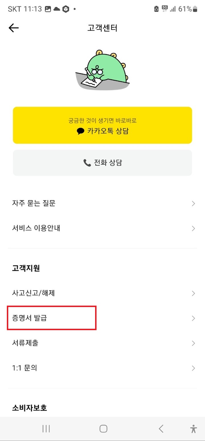Step2. 고객센터 화면으로 이동하게 됩니다. 고객지원 밑에 '증명서 발급' 을 클릭합니다.