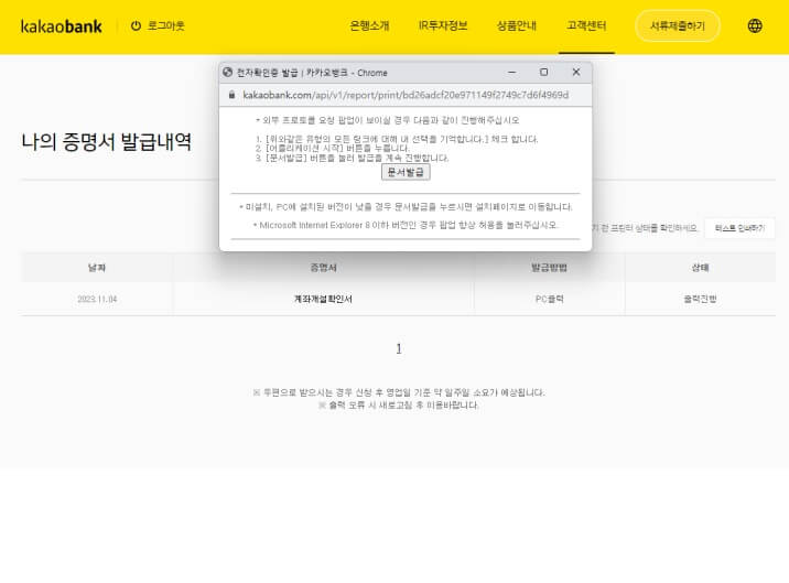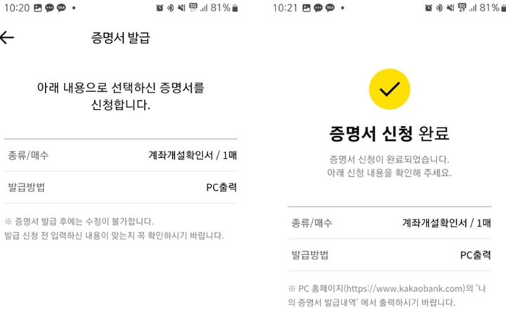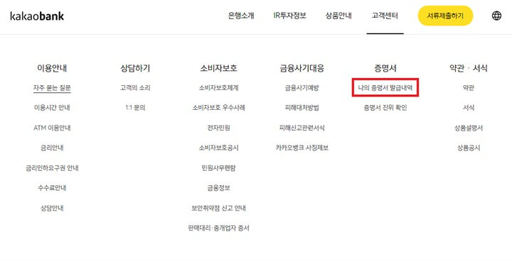 Step8. 이렇게 하면 카카오뱅크 모바일에서 증명서 신청이 완료 됩니다.