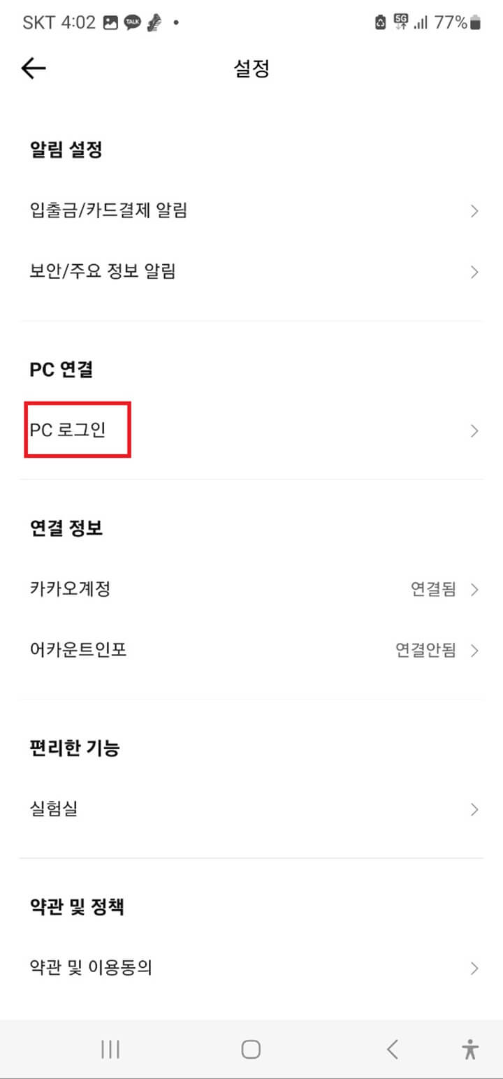 Step14. '앱설정'으로 이동하면 다음화면 중간즈음 'PC 연결 - PC 로그인' 을 클릭합니다.