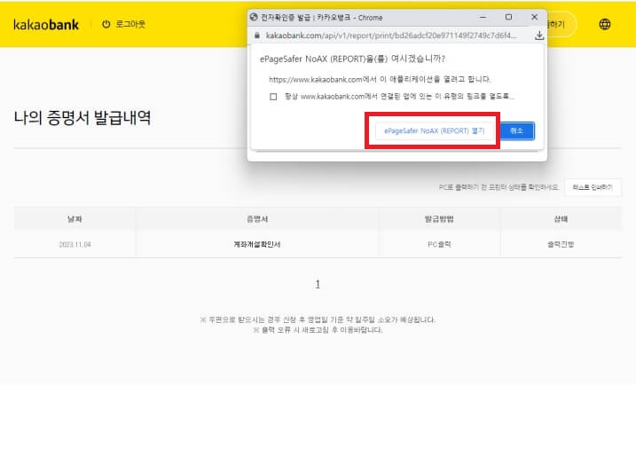 Step21. 'ePageSafer NoAX(REPORT) 열기' 버튼을 클릭하면 아래화면이 뜹니다. 카카오뱅크 통장사본 증명서 발급(계좌개설 확인서)이 완료되었습니다. (개인정보 및 보안상 이유로 캡쳐가 불가합니다. 아래처럼 화면이 띄우게 된 점 양해부탁드립니다.)