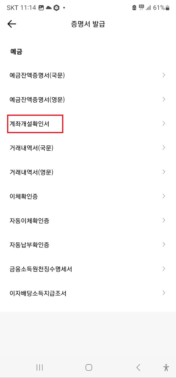 Step4. 예금 밑에 '계좌개설확인서' 를 클릭합니다.