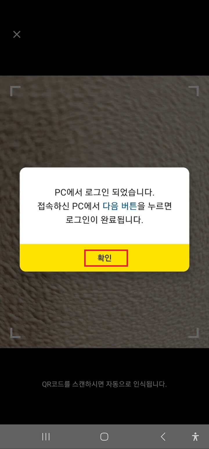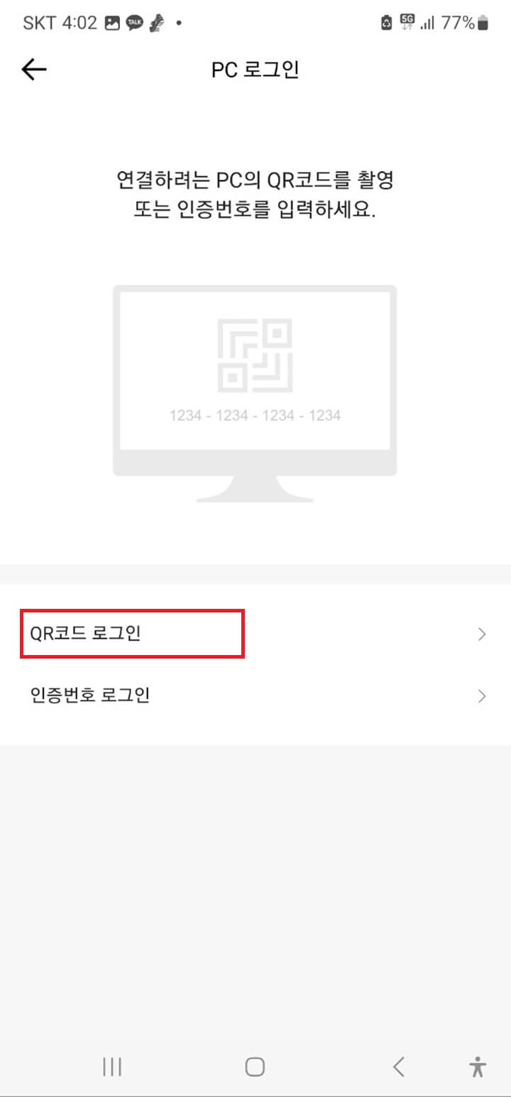 Step16. 아래 QR코드 로그인 화면이 나오면 조금전 PC에서 띄워진 QR코드를 인식합니다. 그럼 PC에서 로그인이 완료됩니다.