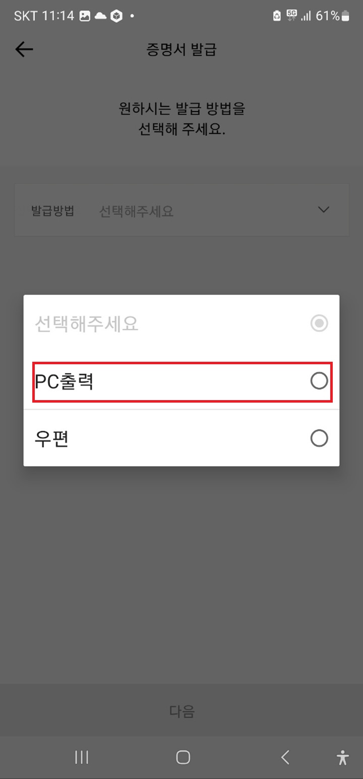 Step6. 다음은 증명서 발급 방식을 선택해야합니다. 'PC출력' 과 '우편' 2가지 방식이 있습니다. PC출력을 선택합니다.( 우편은 소정의 비용이 발생합니다. 참고하기 바랍니다.)