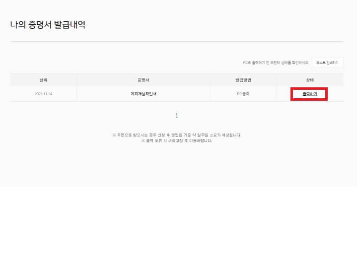 Step17. 로그인된 PC화면을 보면 '나의 증명서 발급내역'을 확인할 수 있습니다. '출력하기' 버튼을 클릭합니다.