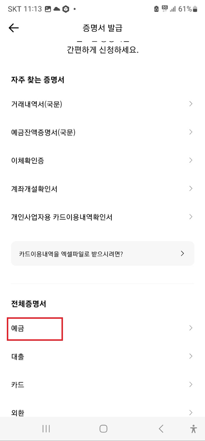 Step3. 증명서 발급 으로 이동하면 내가 개설한 계좌 뿐아니라 대출, 카드, 외환 등 다양한 증명서 발급이 가능합니다. 통장사본이라면 보통 예금계좌가 많으니 중간즈음 전체증명서 밑에 '예금' 을 클릭합니다.