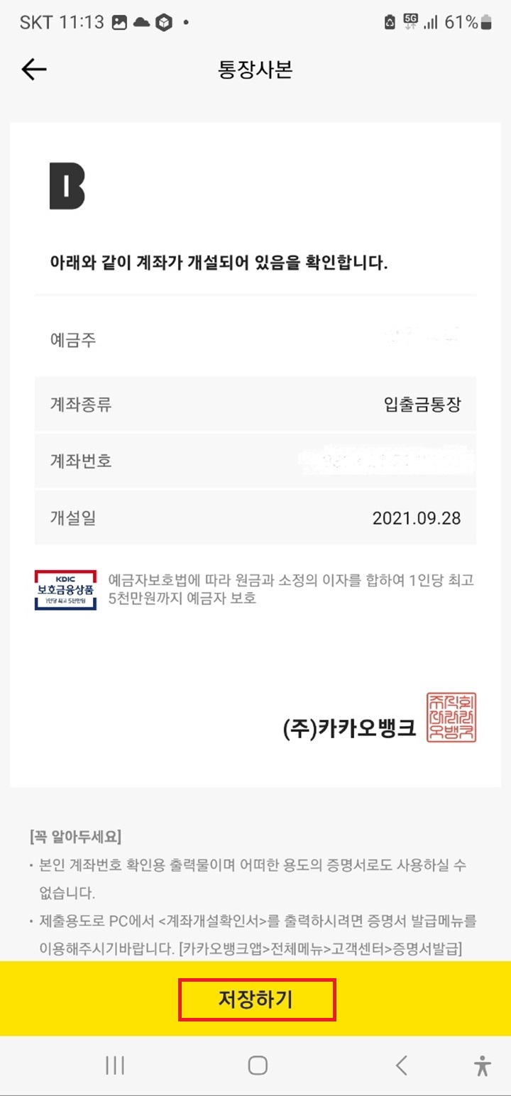 Step4. 계좌가 계설되었음을 확인할 수 있는 통장사본이 조회됩니다. 예금주 / 계좌종류 / 계좌번호 / 개설일 등 일반적인 계좌개설 내용들이 나옵니다. 저장버튼을 눌러 스마트폰에 바로 저장이 가능합니다. 이렇게 하면 카카오톡 통장사본 조회 및 다운이 완료됩니다.