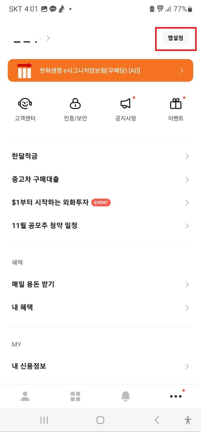 Step13. 다시 모바일로 카카오뱅크 앱으로 와서 아래화면 우측상단 '앱설정' 으로 이동합니다.