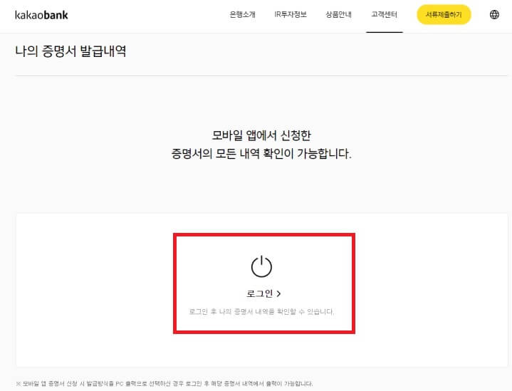 Step11. '나의 증명서 발급내역' 으로 이동하면 모바일 앱에서 신청한 증명서의 모든 내역 확인이 가능합니다. '로그인' 합니다.