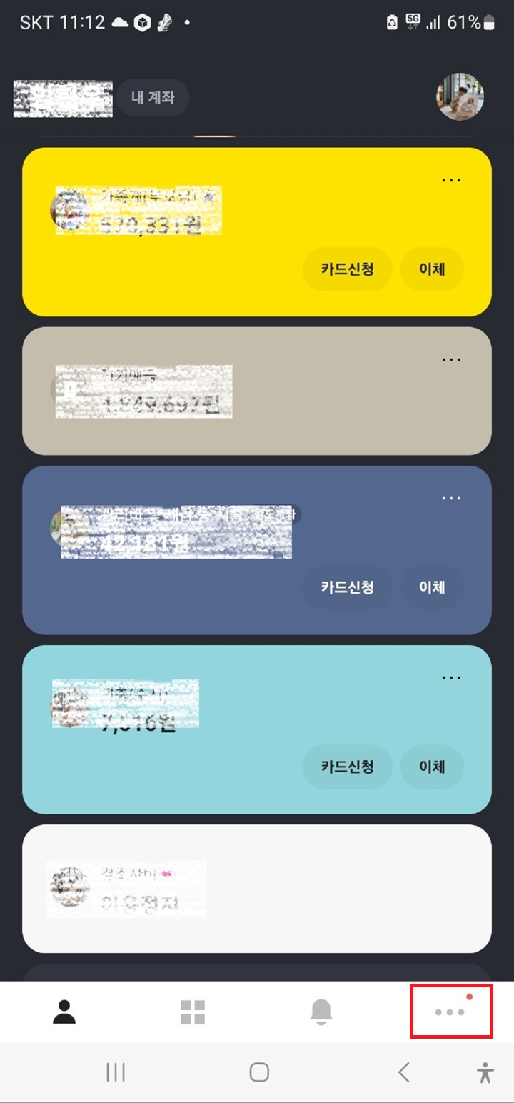 Step1. 카카오뱅크 어플을 실행하시면 아래 사진처럼 내가 개설한 계좌들이 한눈에 보입니다. 그 중 통장사본이 필요한 계좌를 클릭합니다.