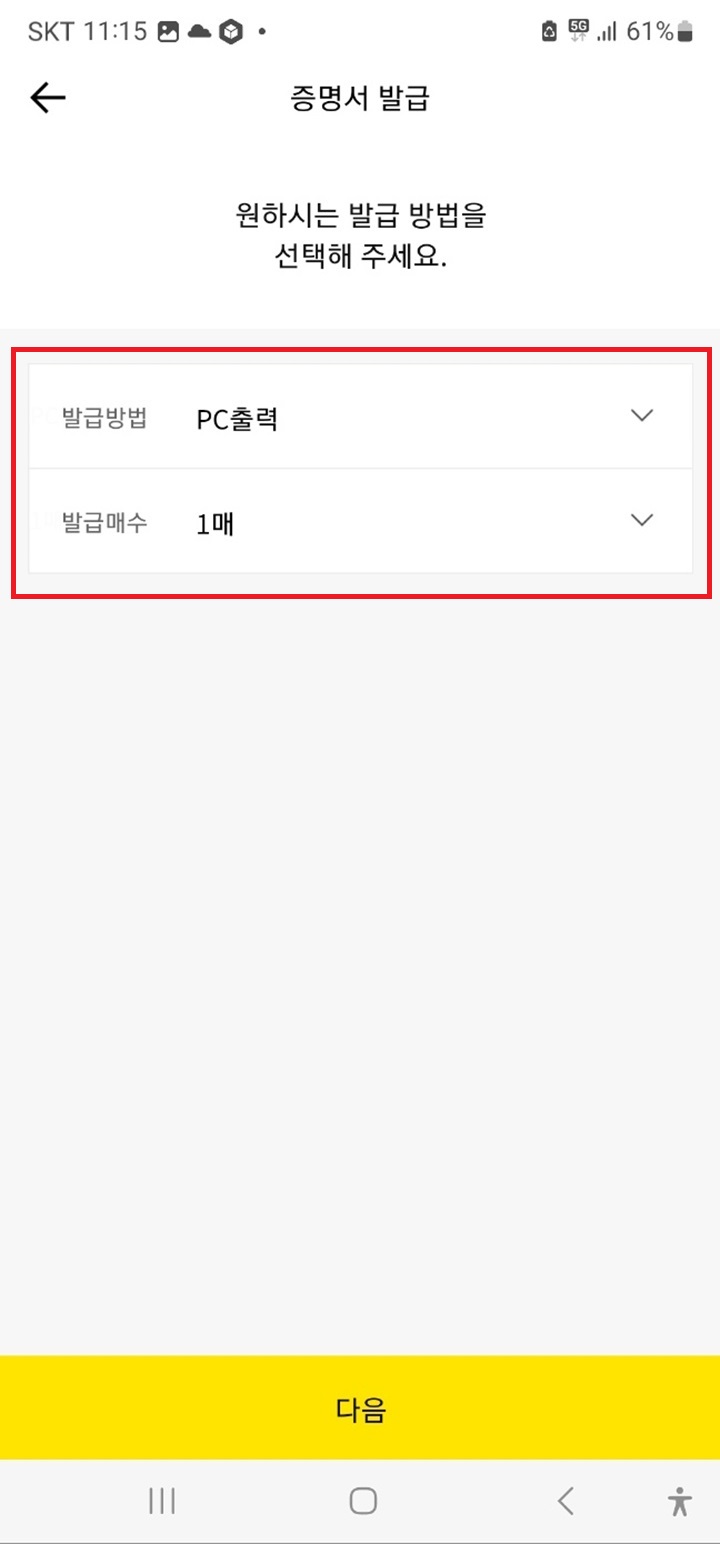 Step7. 발급방식과 매수를 선택하고 '다음'을 클릭합니다.
