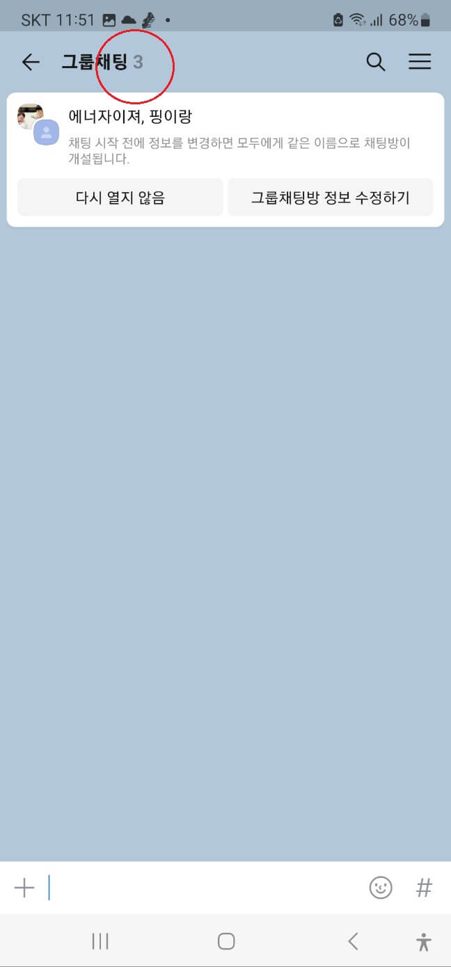 Step4. 단톡방을 개설 후 나를 차단한 것으로 추측되는 사람과(핑이랑), 지인 1명(에너자이져)을 초대합니다. 이때 그룹채팅 3 으로 뜨는 것을 확인할 수 있습니다.