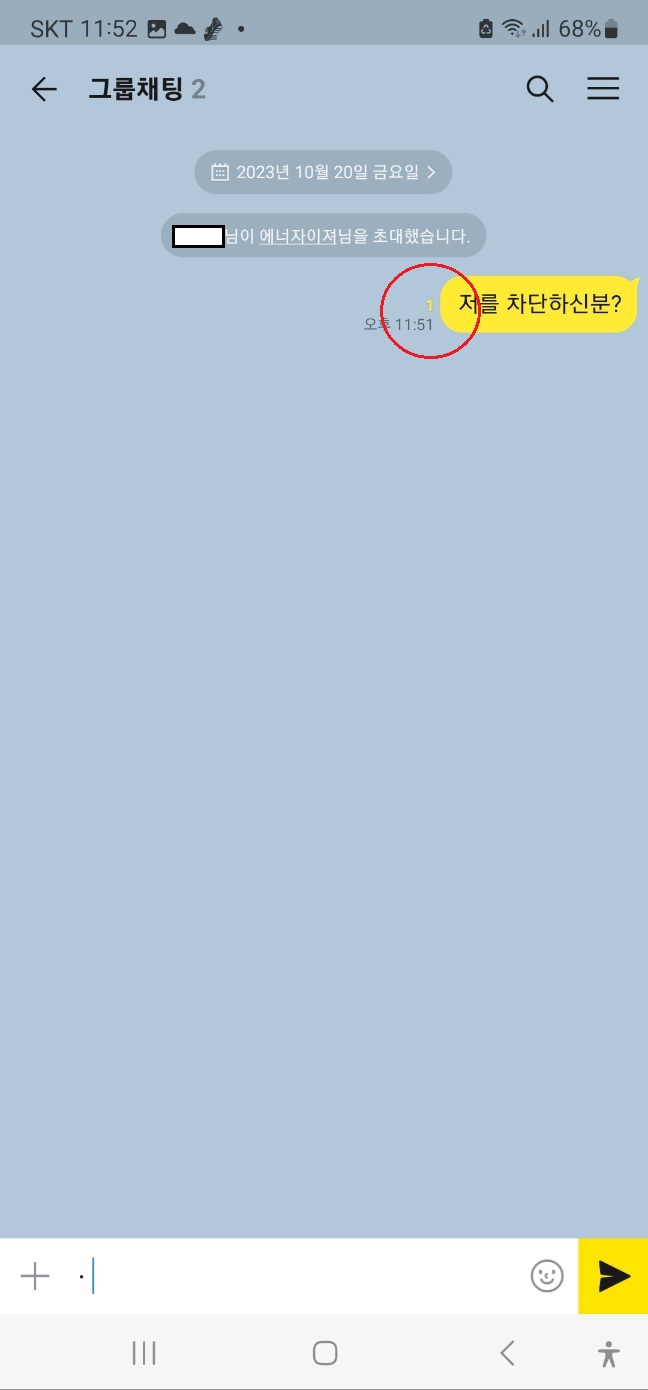 Step5. 이때 대화창에 톡을 입력하면 채팅인원이 그룹채팅 3에서 그룹채팅 2로 바뀌고 아무도 읽지 않았지만 숫자도 '2'가 아닌 '1'로 뜨게 됩니다(채팅방 총인원이 3명이면 톡을 전송했을 때 아무도 안 읽었을 경우 '2' 뜹니다.). 이렇게되면 카톡을 차단했을 거라 추측한 '핑이랑'이 나를 차단한 것으로 확인되는 것입습니다.