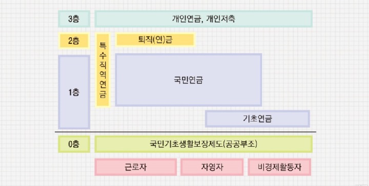 인구는 경제활동(근로자, 자영업자), 비경제활동으로 나눌수 있겠습니다. 사람은 살다 보면, 질병, 부상, 실업, 임신, 출산, 육아, 사망 등 예상치 못한 위기상황으로 경제문제에 봉착할 수 있습니다. 이를 위해 국가가 국민의 기본적인 복지영역을 보장하기 위해 만든 제도가 공공부조입니다. 그것의 대표적인 제도가 바로 국민기초생활보장제도입니다. 소위 '사회안전망' 이라고도 불리는 시스템입니다. 이 부분은 일단 우리나라 연금체계도상 형식적으로 0층에 해당하는 것으로 분류합니다.